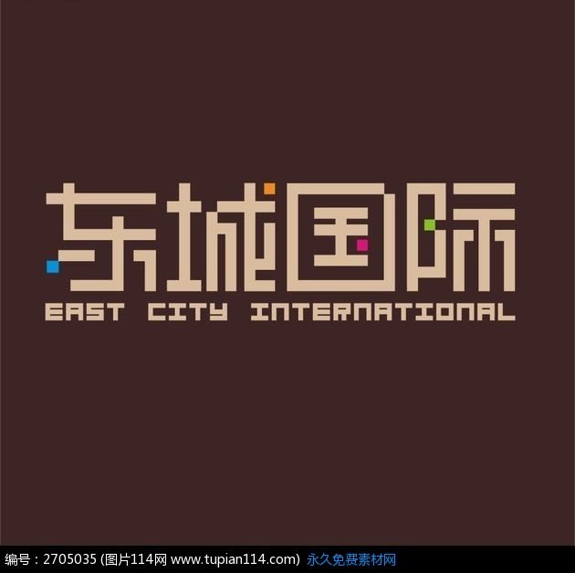 東城國際小區(qū)標志設(shè)計以咖啡背景色襯托和四個彩色的方塊意喻時尚
