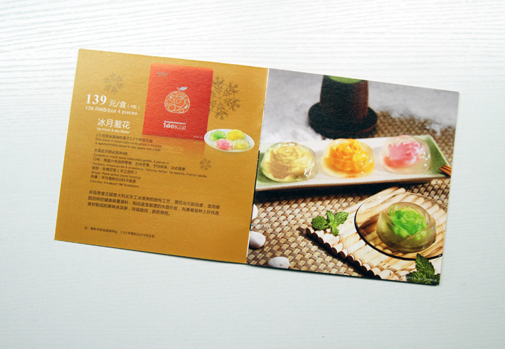 具體的產(chǎn)品介紹,左側(cè)的頁(yè)面設(shè)計(jì)結(jié)合了月餅盒冰淇淋的元素,土黃色的背景是代表月餅,背景上的雪花元素代表著冰淇淋的產(chǎn)品,不脫離主題,具體的文字說(shuō)明選用了和月餅巧克力顏色一致的熟褐色,標(biāo)價(jià)和品牌名選用了比較有反差的白色,顯得十分醒目,右側(cè)是一張整體的產(chǎn)品圖片展示,兩頁(yè)面內(nèi)容明確清晰,色調(diào)統(tǒng)一,中秋的氣氛濃厚。空靈設(shè)計(jì)是一家專業(yè)的品牌設(shè)計(jì)公司。我們?yōu)榭蛻籼峁┳吭降钠放圃O(shè)計(jì)服務(wù)并同時(shí)提供高質(zhì)量的后期視覺(jué)傳達(dá)設(shè)計(jì)及市場(chǎng)推廣方案。