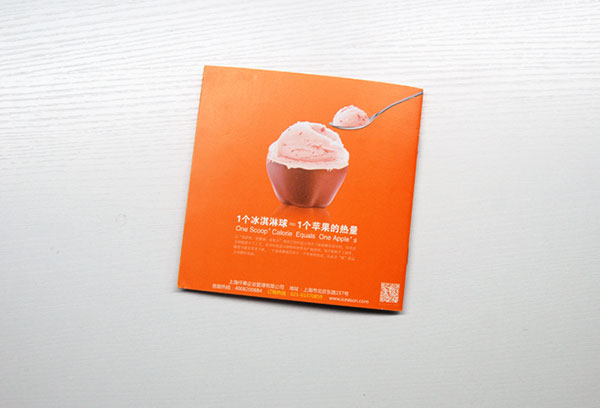 底部背景是整個(gè)畫冊(cè)的主色調(diào)橙色,頁(yè)面的正中間不是logo,而是其產(chǎn)品,并用比較醒目的文字告訴受眾:“一個(gè)冰淇淋球約等于一個(gè)蘋果的熱量”,下面還附帶有小字說(shuō)明,封底與封面的整個(gè)中秋的氛圍有所區(qū)別,是為了告訴受眾,我們是專注做冰淇淋產(chǎn)品的。選擇空靈設(shè)計(jì)的理由:空靈特色一站式服務(wù)客戶:放心、省心、