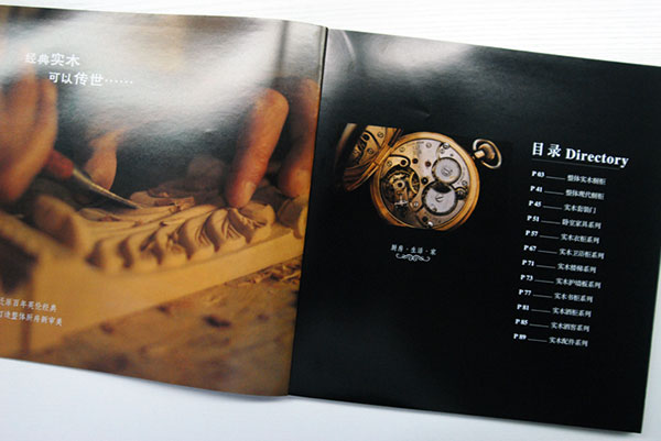 目錄設(shè)計(jì)部分,左側(cè)頁面設(shè)計(jì)師選用了一張木匠師傅精雕細(xì)琢的特寫照片,照片采用了模糊和顏色效果處理,烘托出家具的古典雅致,以及悠久的歷史,更重要的是展示出了其家具做工的精湛、精致。從設(shè)計(jì)、制作、印刷、后期加工、到送貨上門我們實(shí)行一站式服務(wù);與您精誠合作,共創(chuàng)雙贏。