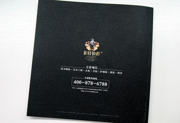 封底設(shè)計(jì)背景也采用了與封面一樣的深褐色,但紋路變成了三角形的花紋,這里是為了烘托萊特伯爵家具精美的的一面,中間的logo相對(duì)封面而言縮小了一點(diǎn),下面用白色的文字標(biāo)注了其經(jīng)營的范圍和電話熱線,均是在整體色調(diào)和氛圍下的點(diǎn)綴,并不影響整體的效果。選擇空靈設(shè)計(jì)的理由:空靈特色一站式服務(wù)客戶:放心、省心、