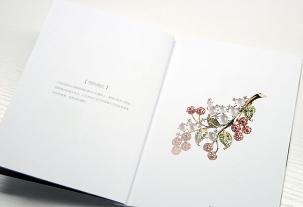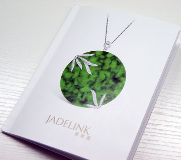 宣傳冊(cè)的封面設(shè)計(jì)清新淡雅,中間是一塊翡翠吊墜,下方是翡翠源的logo和中英文名稱。